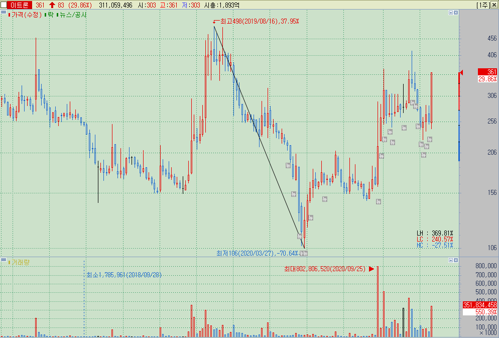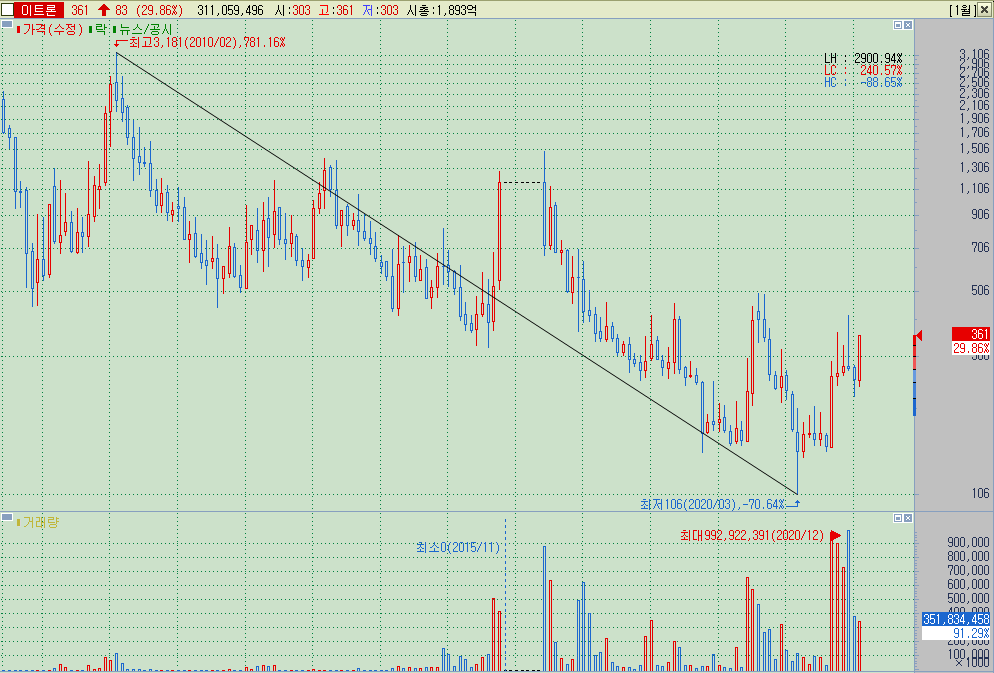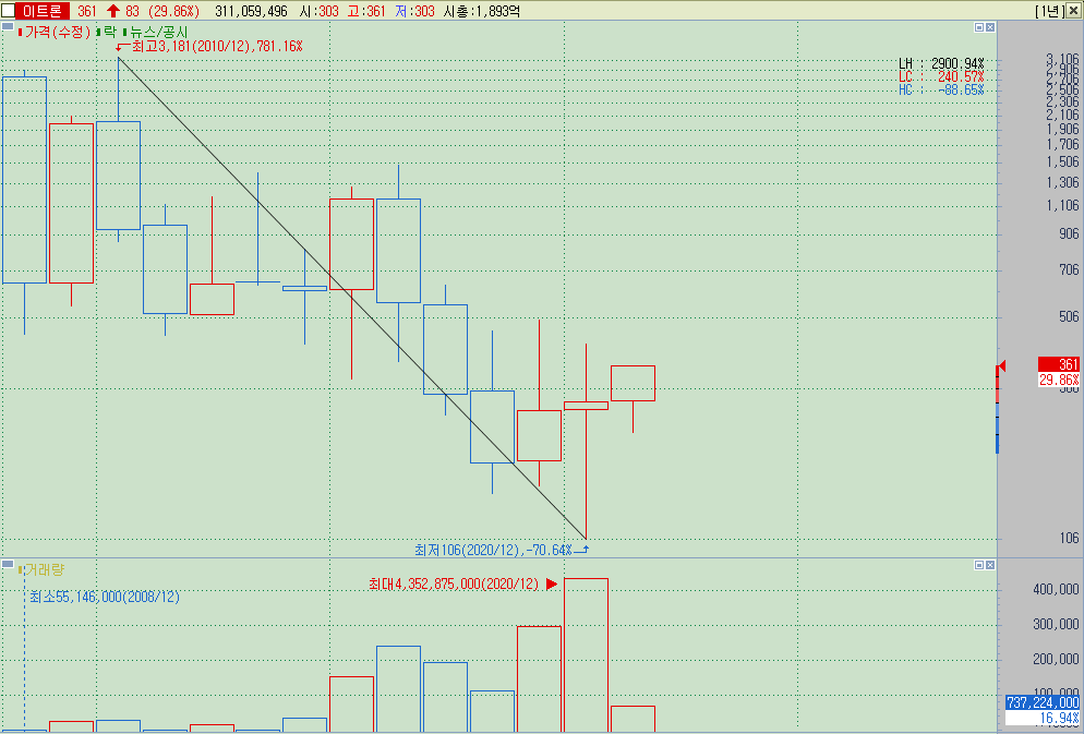 ▲ 2016년 8월 이후 동전주를 벗어나지 못했던 종목이며, 16년 8월 1000원이 뚫리며 코로나 급락장에서는 106원이라는 가격까지 내려갔던 종목. 차트상으로 이름과 가격을 떼고 살펴보면 무난한 종목 같아보이지만, 그간의 이력을 살펴보고 동전주라는 점과 재무구조 등의 기본기를 감안하면 진입하기에 위험한 종목임을 알 수 있다.