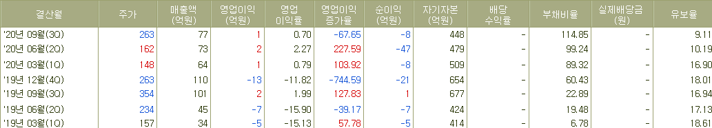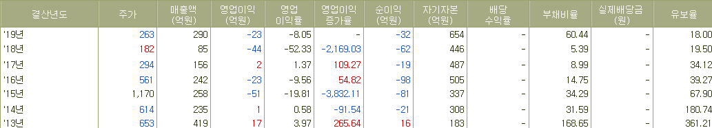 ▲ 하지만 이런 기술적인 포인트를 대고 이 종목을 해석하면 안된다. 100원부터 400원까지 고루 퍼져있는 매물들이 언제 어디서 가격을 내리고 올려도 전혀 이상할 일이 없는 수급을 만들어놓았기 때문이다. 그리고 2014년부터 계속되고 있는 순이익 적자행진이 멈춰지지 않는 상황과 유보율이 0을 향해 줄어가는 상황 역시 주가에 악영향을 끼칠 수 있는 위험요소들이기에 주가가 어떻게 움직여도 그냥 지나치기를 권하는 것이다.