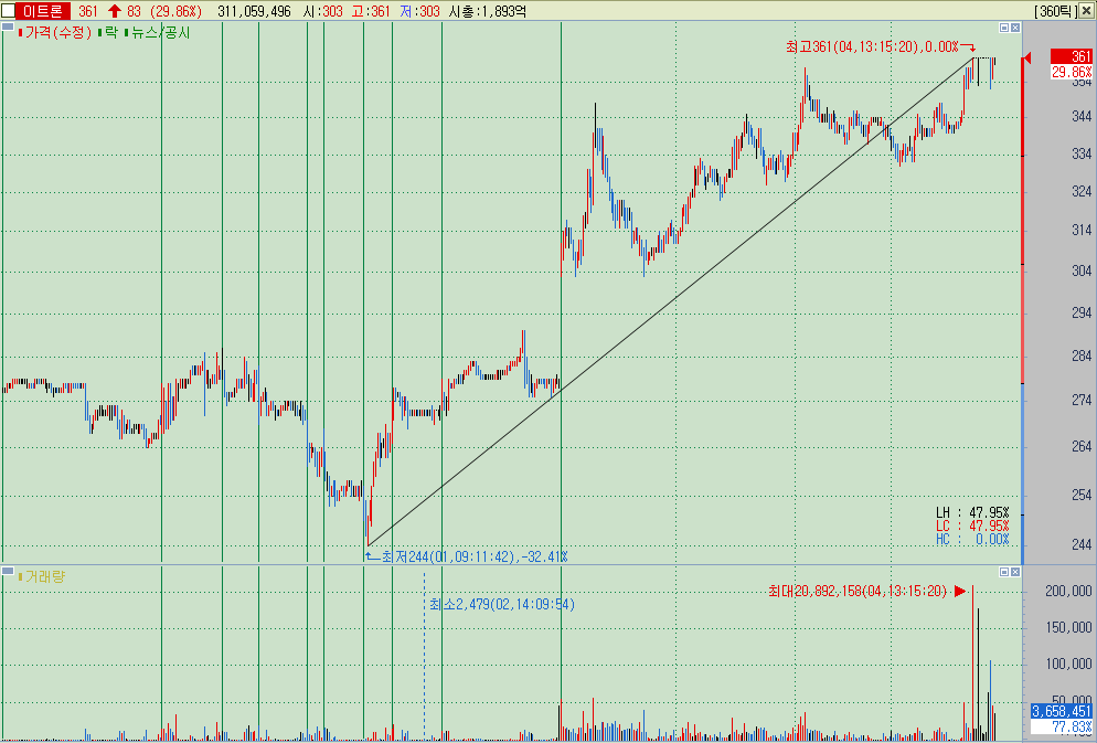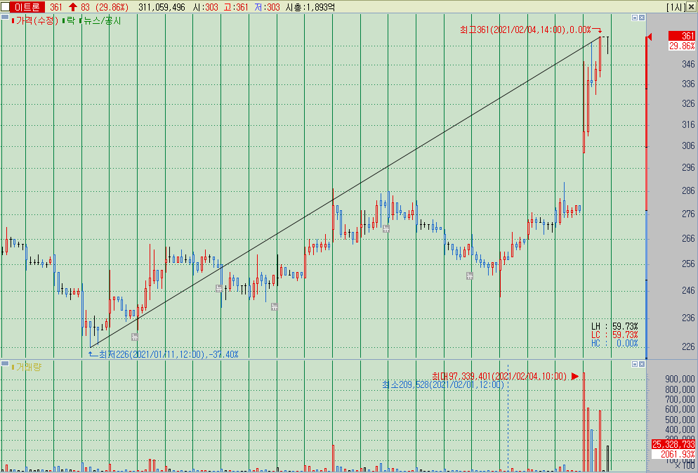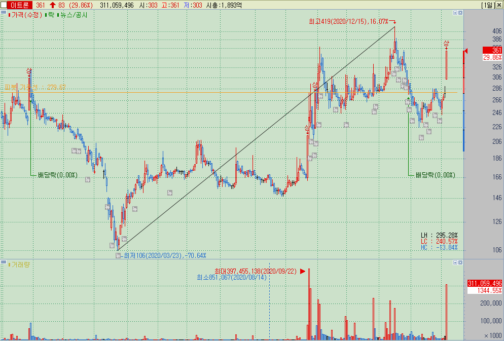 ▲ 보통 이렇게 장기저항을 장대양봉 상한가로 돌파한 종목에 대해서는 좋은 점수를 주고 포인트도 정확하게 잡아나가는 편이다. 앞에서 말했던 것과 비슷하게, 종목 이름이나 배경을 가리고 가격만 남긴 상태에서 살펴보면 340원만 지지받고 가도 전고점은 충분히 돌파해야하고, 그것이 안되더라도 330원 305원 등의 지지라인이 존재하며, 최악의 경우 200원 초반까지 갔다가 돌아나오더라도 제 길을 간다고 했을 것이다.