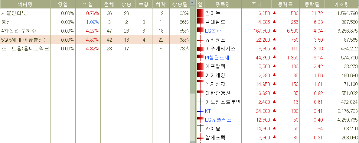 ▶ 스마트홈(홈네트워크) 관련주, 통신 관련주, 사물인터넷 관련주, 5G(5세대 이동통신) 관련주, 4차산업 수혜주.