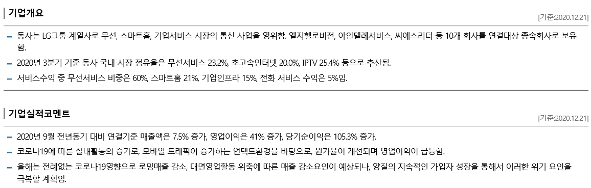 ▷SK증권은 동사에 대해 지난해 영업이익이 사상 최고치를 기록한 가운데, 올해에도 탑라인 성장과 수익성 개선 기조가 유지될 것으로 전망. 올해 5G 가입자가 핸드셋기준 24.3%까지 상승하며 무선부문 실적 개선 기조가 이어질 것이며, 양질의 가입자 기반 유선부문 실적 개선 기조도 이어질 것으로 전망. 특히, 5G, IPTV 등 올해 통신부문 중심의 호조가 예상됨에 따라 통신부문에 집중된 포트폴리오를 보유하고 있는 동사의 수혜가 기대된다고 밝힘.