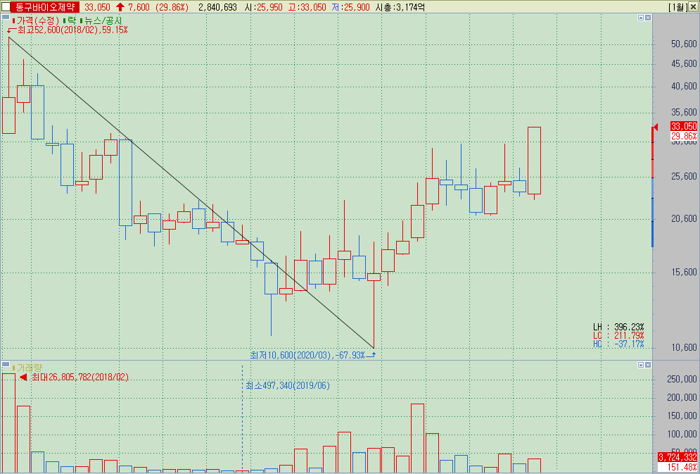 ▲ 기본기도 좋고, 20년 여름부터 형성된 박스를 거래량이 동반된 장대양봉으로 돌파한 것도 의미가 있다. 30000원 전후의 지지를 받고 간다면 상장 초이자 종목상 최고가인 5.26만원 까지도 갈 수 있는 상황.