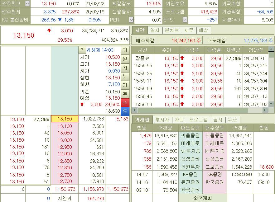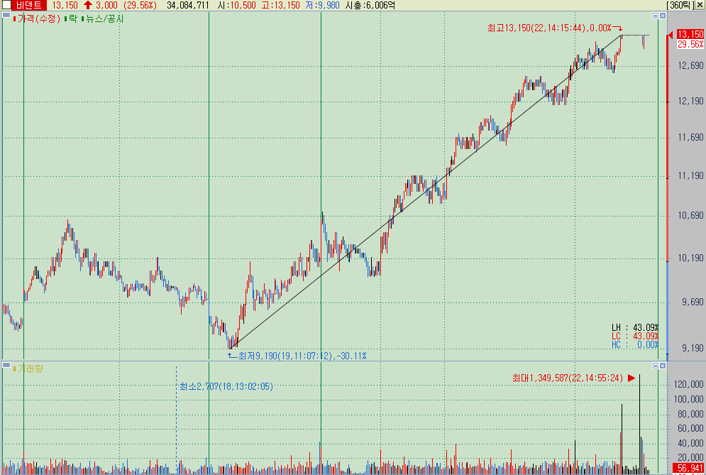 ▲ 여기서부터 상승을 바라보는 포인트는 16000원과 18000원을 각각 장대양봉으로 돌파하는 것인데, 현재는 조정을 받는다 해도 세 포인트에서 각각 지지를 받아주면 무조건적인 우상향이 가능한 구간임. 10400원 밑으로의 단가 조절이 가장 좋은 방법이지만, 이미 상한가 가격에 도달했고 대기매수 물량도 100만주가 넘는 상황이라 이런경우는 먼저 22일 상한가 종가와 직전 지지포인트 중간 지점인 11700원 근처에서 지지를 받는지 확인을 하고 밀리면 추가매수를, 상승하면 언급한 가격들에서 부분매도 등의 포지션을 취할 수 있음.
