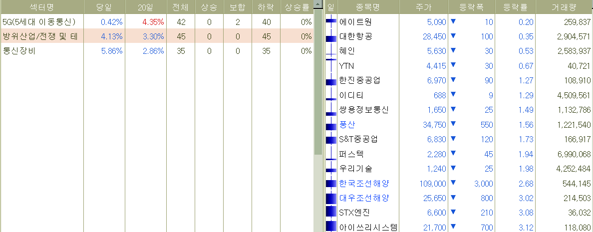 ▶ 통신장비 관련주, 방위산업/전쟁 및 테러 관련주, 5G(5세대 이동통신) 관련주.