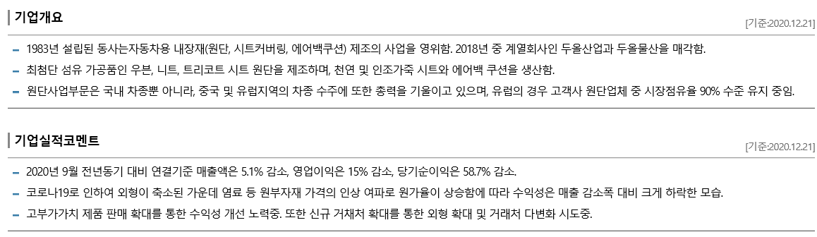 ▷동사는 언론을 통해 최대 고객사인 현대자동차의 전기차 주요 차종인 '아이오닉 5' 시트커버 및 친환경 원단 수주를 확정하고 3월부터 양산공급에 들어간다고 밝힘. 아이오닉은 현대자동차의 미래 친환경 전략 차종으로 전기차 플랫폼 E-GMP(Electric-Global Modular Platform)를 기반으로 한 준중형 차량이며, 동사는 이번 수주를 통해 향후 5년간 해당 모델향으로만 친환경 원단과 시트커버를 합쳐 약 1,200억원 규모의 매출원을 확보하게 된 것으로 전해짐.