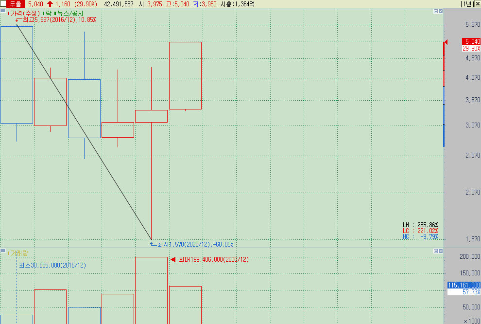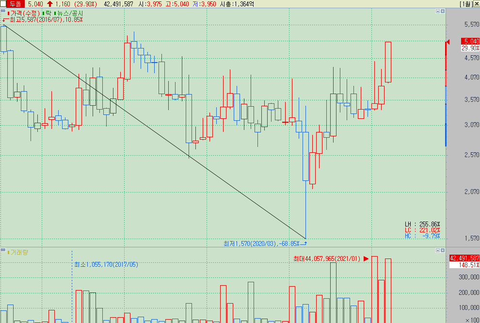 ▲ 기본기도 나쁘지 않고 주가 방향도 험한듯 하지만 코로나 급락 및 회복구간을 제외하고는 큰 의미의 박스를 형성하던 종목이라 우상향을 바라보는 매매를 해도 괜찮을듯. 하지만 현재 상한가 가격에 바로 잡는 것은 어려움이 있다.