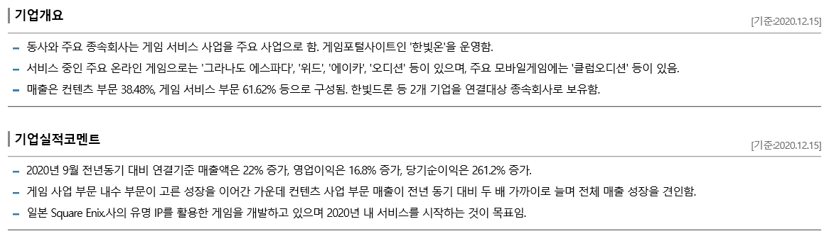 ▷동사는 언론을 통해 스퀘어에닉스와 공동 개발하고 동사가 서비스 예정인 모바일게임 기대작 '삼국지난무'의 한국 사전예약 참여자 수가 70만명을 돌파했다고 밝힘. 게임은 오는 11월16일 한국, 일본 대만 등 3개국에 동시 출시될 예정이며, 동사가 한국 지역 서비스를, 스퀘어에닉스가 일본과 대만 서비스를 제공할 예정임.