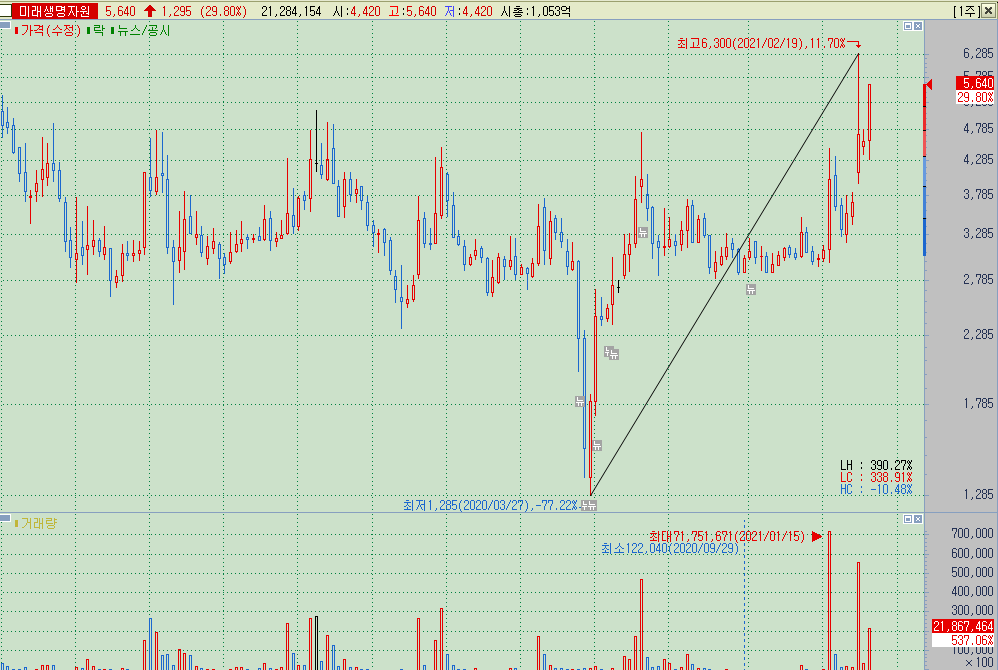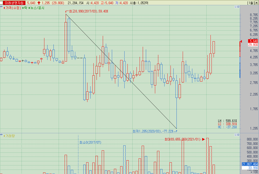 ▲ 앞으로도 이 종목은 폭이 큰 핸들링을 하겠지만, 구간이 지켜진다는 전제 하에 우상향 상승이 일어날 것인데, 대개는 상한가와 상한가를 동반한 급등폭을 기준으로 움직이게 될 것이다. 현재 시점에서의 조정은 4800원 까지만 버텨낸다면 다음 구간으로의 진입이 가능해진다. 단, 4400원 위로의 물량이 3년간 물량 중 16%가 조금 넘는 적은 물량이기 때문에, 매매 기간에 따라서는 주 매물대인 4000~4400원까지도 체크가 필요하다. 단기로만 본다면 5300원이 지지라인이니 참고.