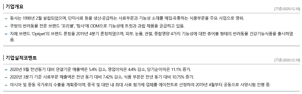 ▷아울러 반려동물 건강기능식품 '옵티펫' 온라인 쇼핑몰도 오픈하며 성공적으로 펫푸드 사업에 진출했으며, 식용란 선별포장업 시행에 따른 임가공 매출도 증가할 것으로 전망.
