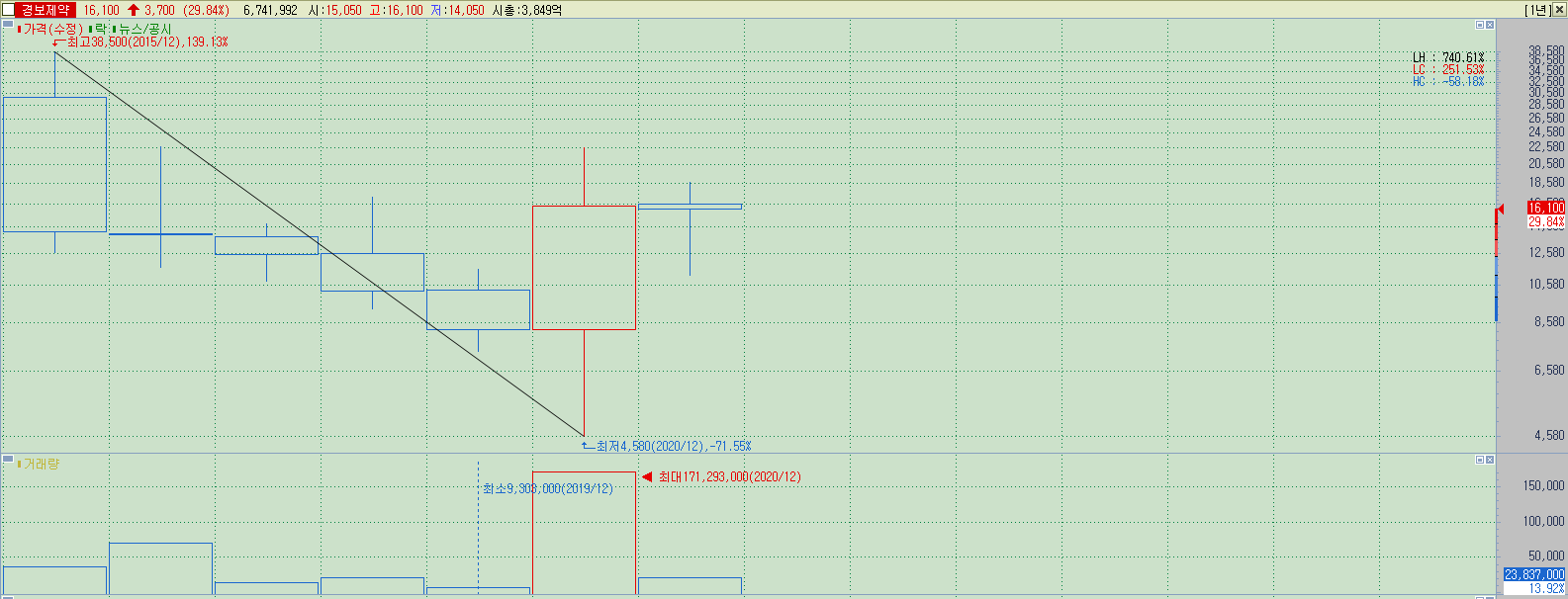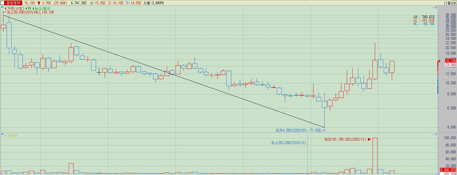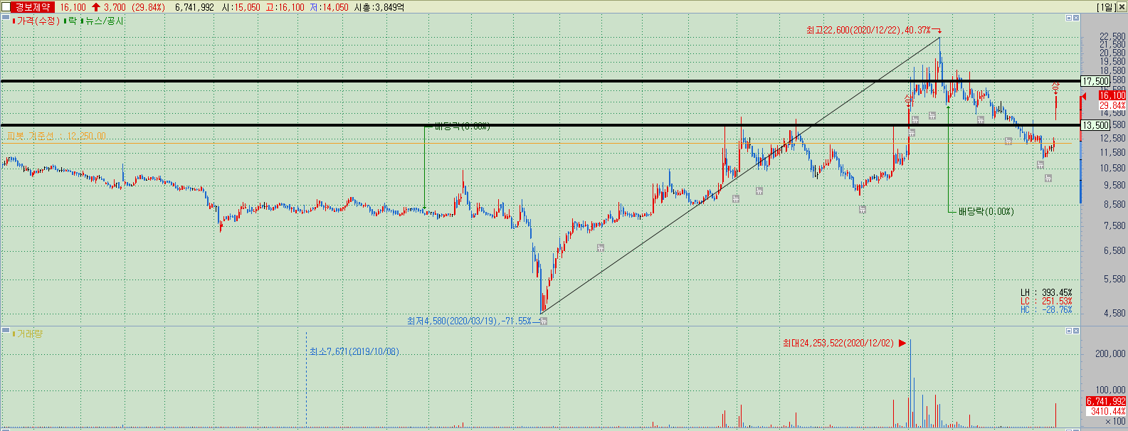 ▲ 기본기도 괜찮고, 가격 확인도 받았으며, 상한가로 의사표시도 확실하게 해주는 종목이기에 기본 방향성은 변하지 않는다. 현재 가격에서 17500원 근처 장기저항까지가 멀지 않기에, 한 번에 돌파를 하거나, 상한가 이후 쉬고가는 움직임이 있다고 해도 느리게나마 돌파할 가격이 될 가능성이 높다.