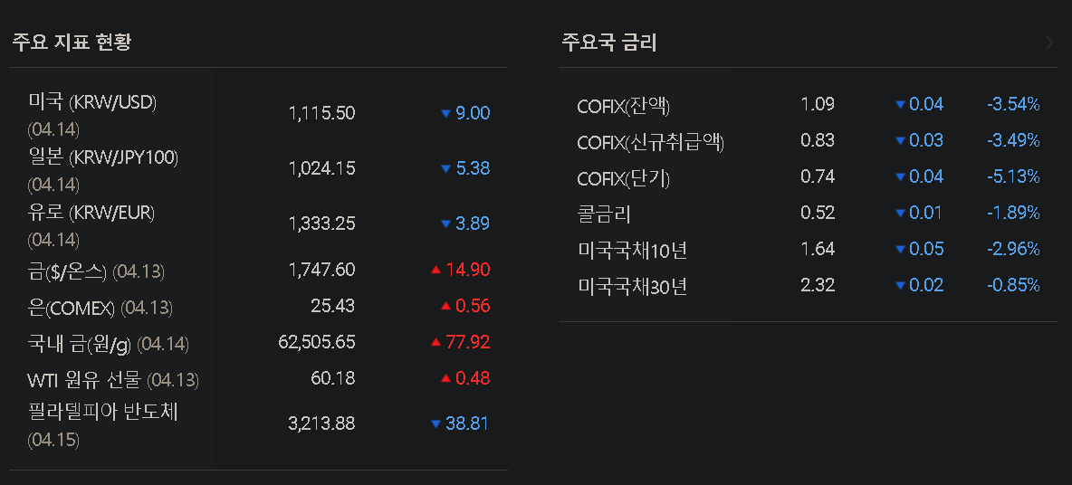 2021.04.14 - [WhaleStockLab/Schedule] - 오늘의 증시일정 : 국내증시 미국증시 달러환율 금시세 금리 원유 선물