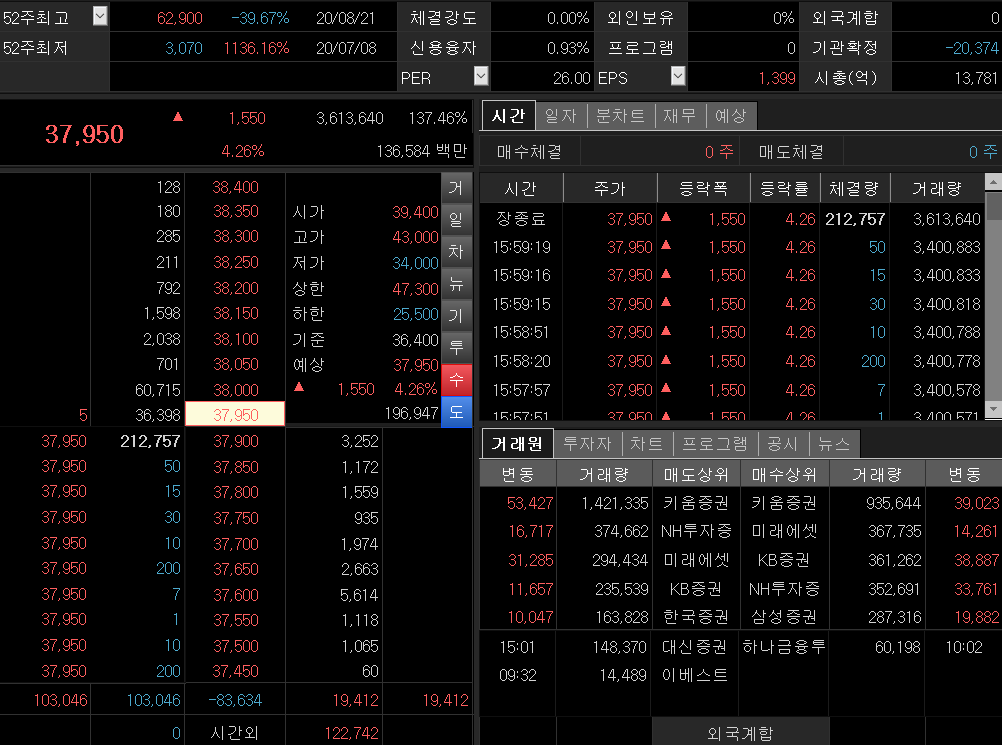 ▶ 하지만 현재 구간이 가장 주의가 필요한 영역이다. 이전 고가 영역과 어깨를 나란히하고 있고, 장기저항에 까지 부딪친 상황이라 현재 구간에서 힘있는 돌파를 하고 38000원 위에서 가격을 안착시키지 못하면 최소한 4월 26일 상한가 종가인 25500원 까지는 내려갈 수 있는 명분이 마련된 상태이다.