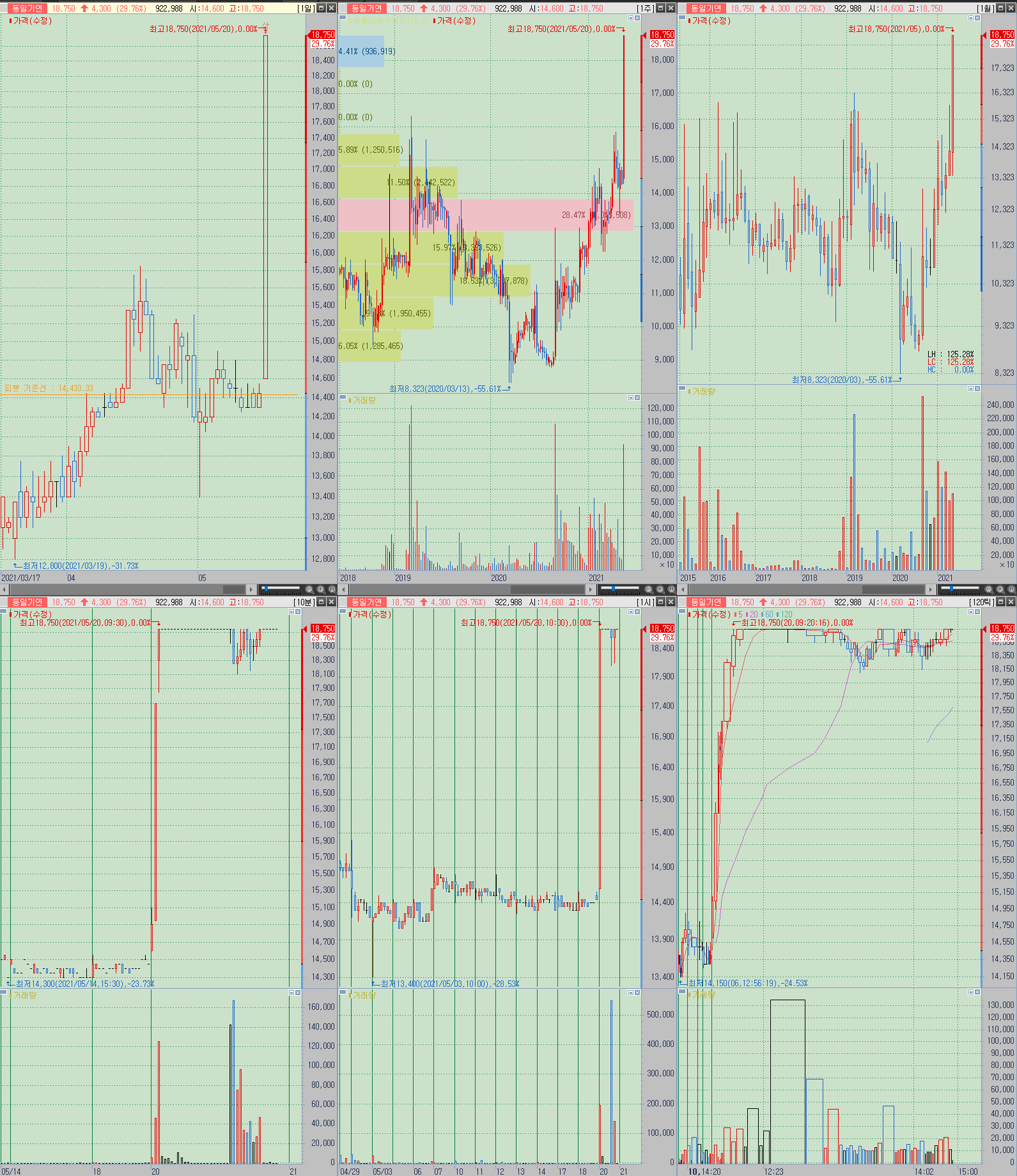 ▲ 기본기는 무난한 편이며, 5월 이전에도 윤석열 관련주로 시장에서 계속 테스트를 받아왔던 종목. 작년부터 장기 저항을 돌파하려는 시도를 꾸준히 해왔으나 번번히 근처에서 실패하고 가격이 빠졌는데, 이번 상한가로 인해 장기저항이 장대양봉을 동반하여 돌파가 된 상황.