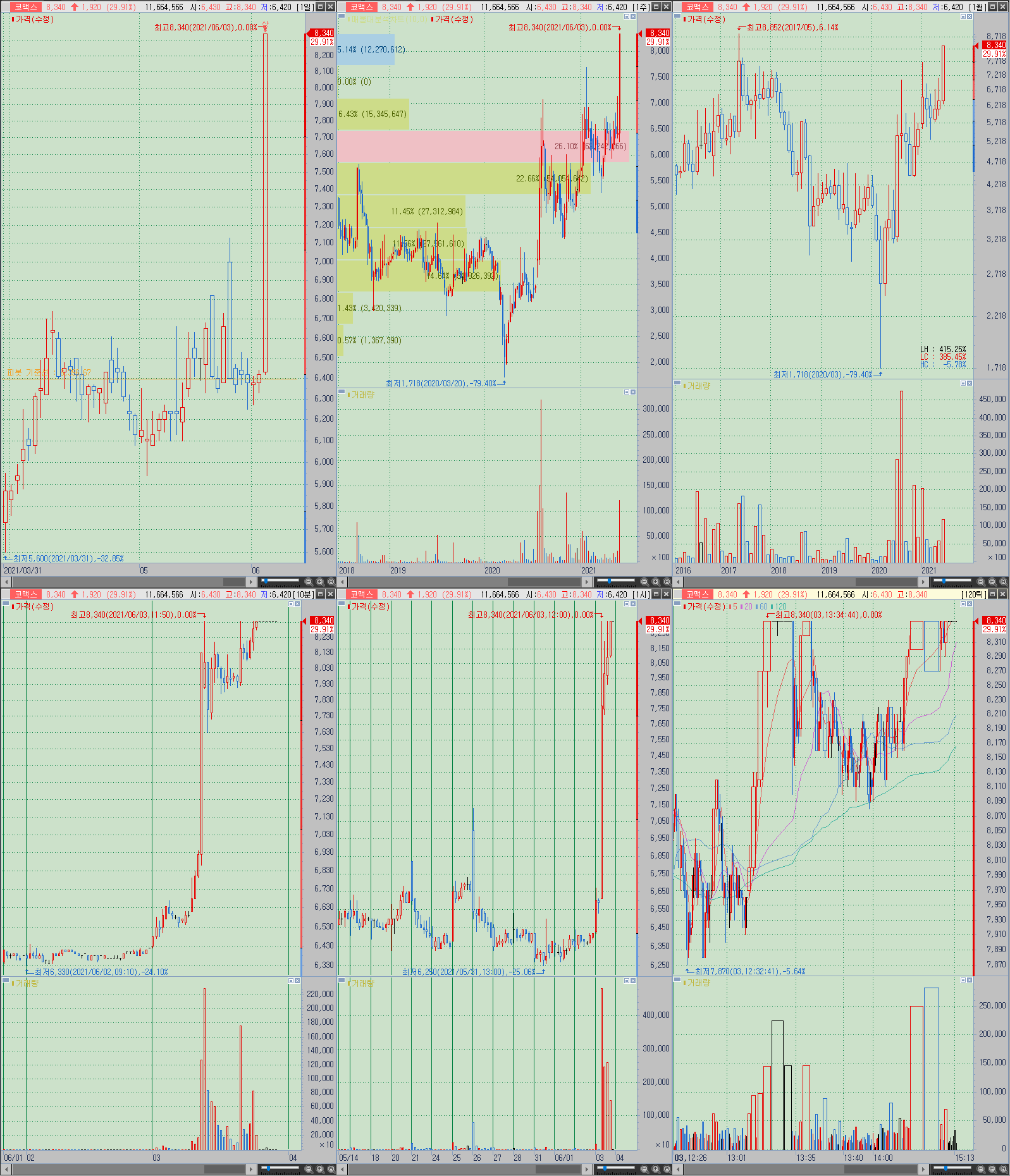 ▲ 저점에서 돌림이 나오면서 장기저항을 두 번 정도 돌파했는데 실패로 돌아갔으며, 그럼에도 불구하고 조정폭을 짧게 가져감과 동시에 저점갱신형 우상향을 이어가고 있음. 전일 상한가에서 또 한 번 장기저항을 돌파했고 7400원의 지지여부에 따라 다음 1만원 시세의 진입을 노려볼 수도 있는 상황.