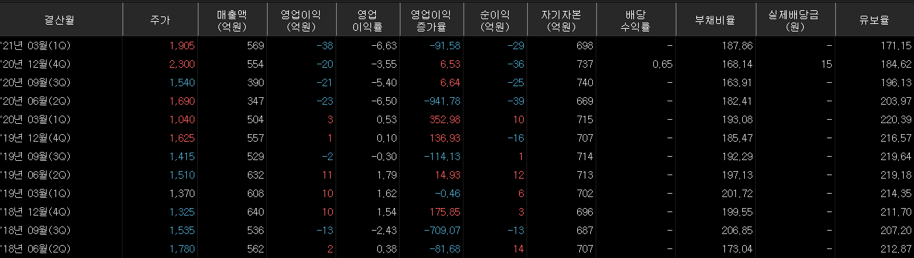 ▲ 20년 순이익이 적자로 돌아선 상태이며 21년 1분기에도 상황이 나아지지 않아 기본기로 접근하기는 어려운 상황. 현재 자리에서 가격을 더 올리려면 관련주로 좀 더 강하게 엮이는 것 말고는 재이탈의 확률이 올라갈 수 밖에 없다.