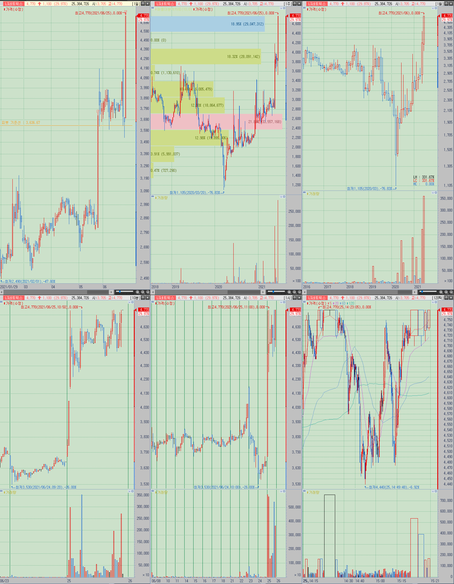 ▲ 정석으로 주의해야 하는 구간은 5000원이며, 일반적인 흐름으로는 급등이 몇 차례 더 나올 수 있으나, 유통물량이 거의 잠겨있다시피 한 품절주이기 때문에 예측의 범위를 평소보다 조금 더 까다롭게 좁혀서 대응하는 것이 필요. 물량을 잘못 늘리게 되다가 탈출구간 자체를 놓치는 것이 품절주이기도 하다.
