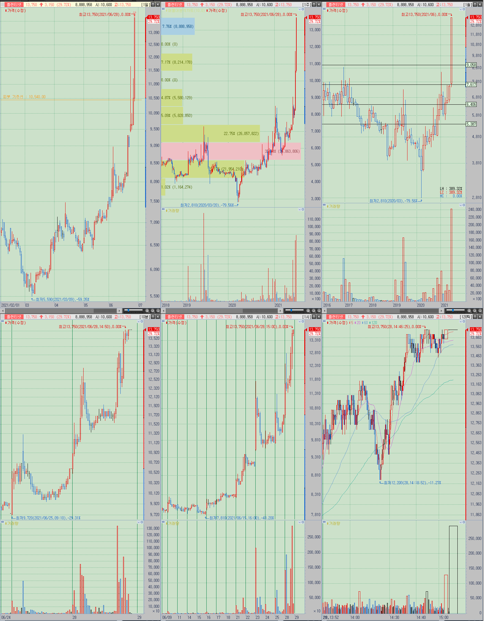 ▲ 잔돌리기 이후에도 조정을 가정할 때, 10000~10500원을 버텨주면 되는 종목이며, 장 막판에 잠긴 상한가이기 때문에, 다음 급등이 온다해도 15000원 근처에서는 부분매도 등의 대응이 필요해보임. 기술적 포인트인 장기저항의 지지영역은 9000~9500원 근처이지만 이 가격까지 밀리면 추세가 전환될수도 있음에 주의가 필요하다.