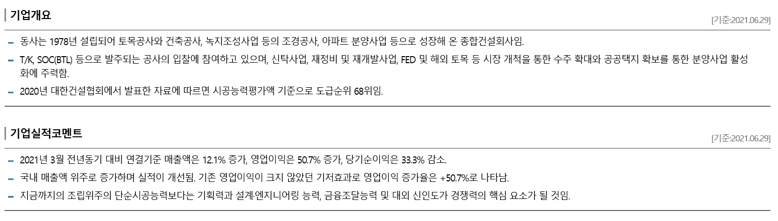 ▷대한토지신탁(주)과 450.33억원(최근 매출액대비 13.21%) 규모 공급계약(전남 구례읍 백련리 공동주택 신축사업) 체결(계약기간:2021-06-29 ~ ) 공시.