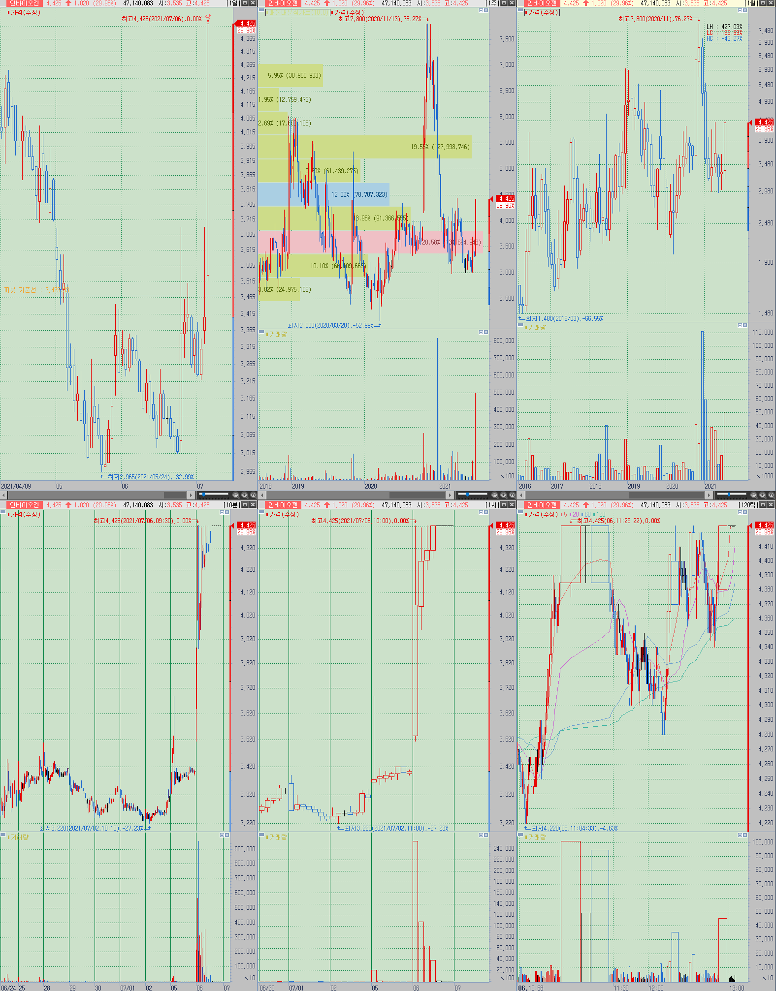 ▲ 단기 상승폭은 최대 6500원 근처이며 장대양봉과 거래량을 동반한 상승으로 가격 도달시 전고점인 7800원까지의 상승 확률도 높아지지만, 일단 앞에 이야기한 포인트들을 지켜내는지가 먼저 체크해야하는 부분임. 이상태에서 거래가 줄어들면 3500원까지 빠질수도 있는만큼 진입 구간 설정에서 고민이 필요하다. 기본기가 좋은편은 아니기에 단기 이상의 포지션 보유 역시 권장하지 않음.