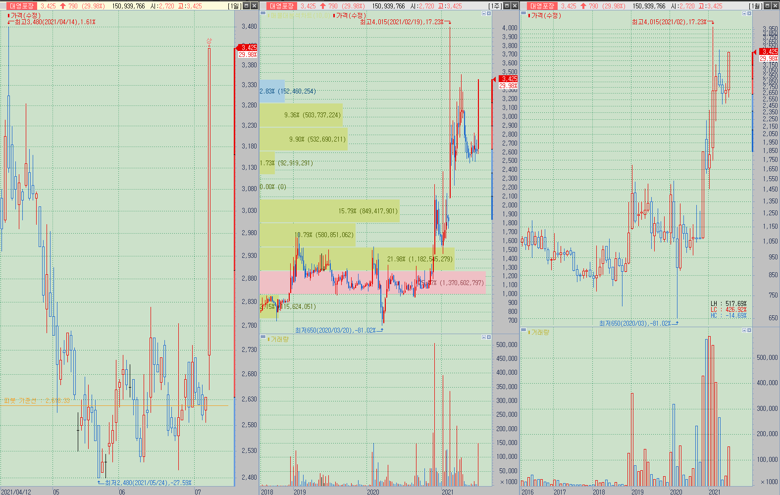 ▲ 코로나 확진자수 증가에 골판지 섹터 대장이 되어 상한가에 진입함. 20년 11월, 21년 2월 계단식 상승이 있었고 2월 이후 3개월동안 조정을 받고 2상 시작자리 근처인 2500원 즈음에서 가격이 다져지며 가격을 모으던 모양. 이전 상승들도 전부 코로나 이후 택배 대란으로 인한 급등임.