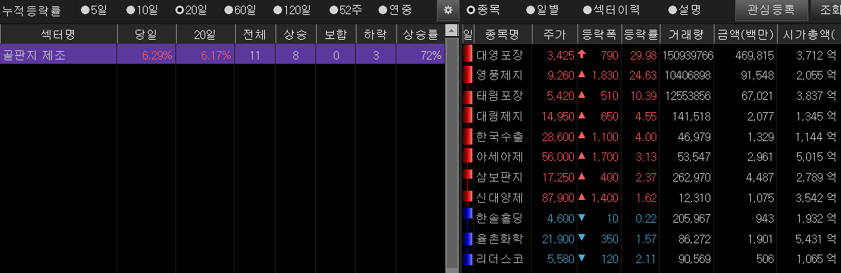 2020-11-27 코로나19 확산세 지속 속 골판지 가격 인상 기대감 등에 골판지 제조 테마 상승 속 급등