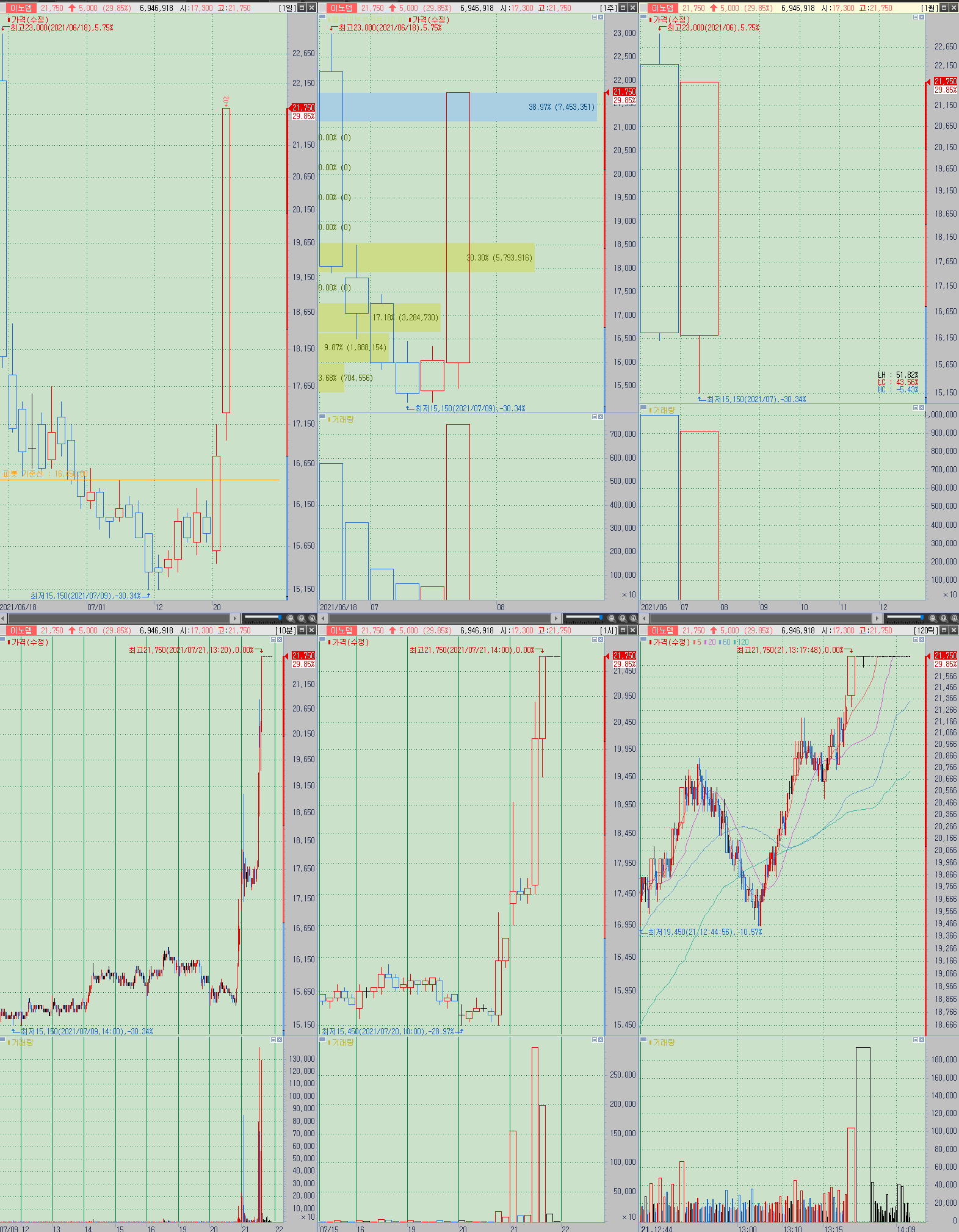 ▲ 메타버스 관련 상한가. 신규상장 첫 날에 급락한 이후 7월 9일 15150원 이후 하락을 멈추며 20일과 21일 연속으로 상승 후 상장 시가 근처까지 도달했다.