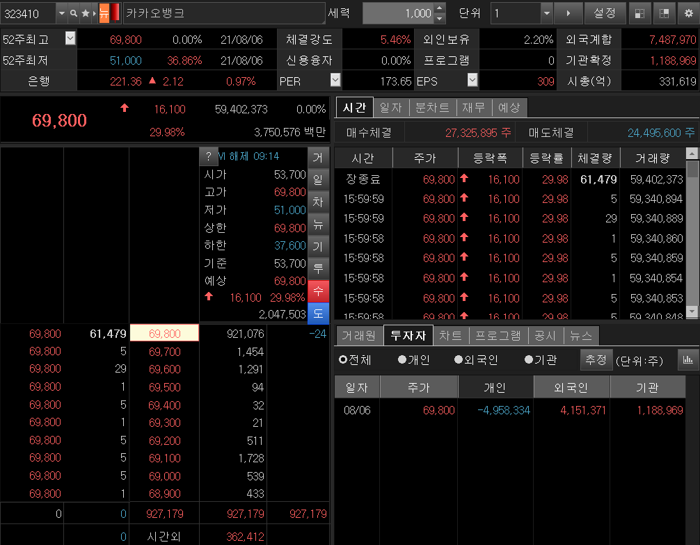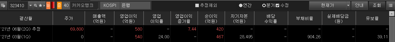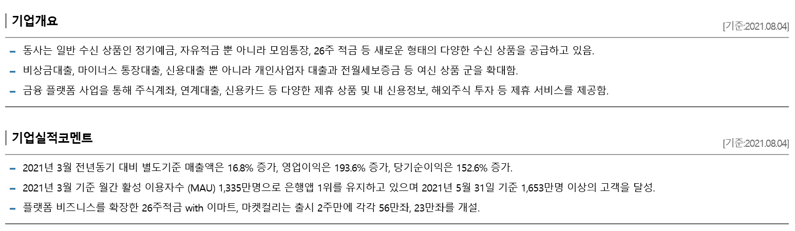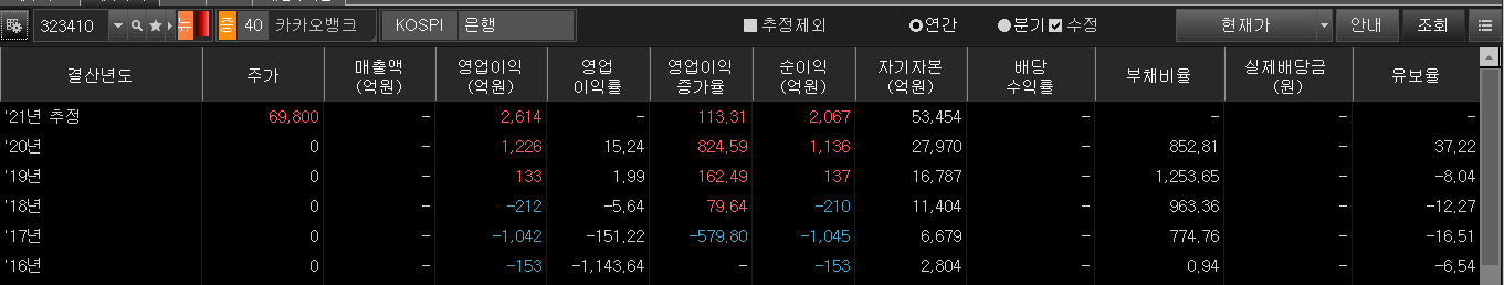 ▷금일 코스피시장에 신규 상장한 동사의 주가는 공모가 39,000원을 상회한 53,700원에서 시초가를 형성한 뒤 상한가로 마감함. 동사는 카카오그룹 계열의 인터넷 전문은행임. 시장에서는 기존 은행주의 PBR은 0.44배, PER은 5배 수준이지만, 동사의 공모가 기준 PBR은 3.7배, PER은 56배에 달해 고평가 논란이 제기되고 있음.