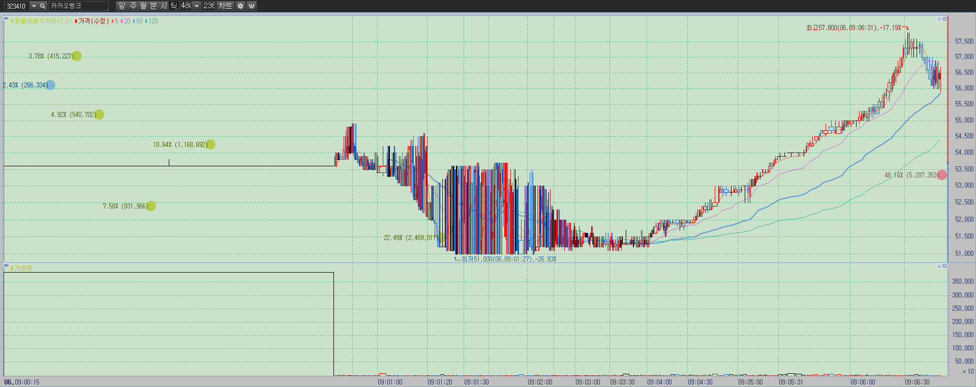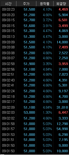 ▲ 이 체결을 틱으로 보게되면 51000원의 저가를 어떻게든 지지하려는 움직임을 볼 수 있는데, 체결이 줄어들고 당일의 지지라인을 확인하며 이후 방향을 결정하는 9시 4분 이후의 움직임에서 매수를 들어가보는 것이 일반적이며, 이것은 결과론적 관점이 아닌 패턴으로만 접근했을때의 이야기임. 기본기가 되어있는 종목에서 이런 흐름이라면 손실 위험이 있어도 소량 접근을 해볼만 하다.