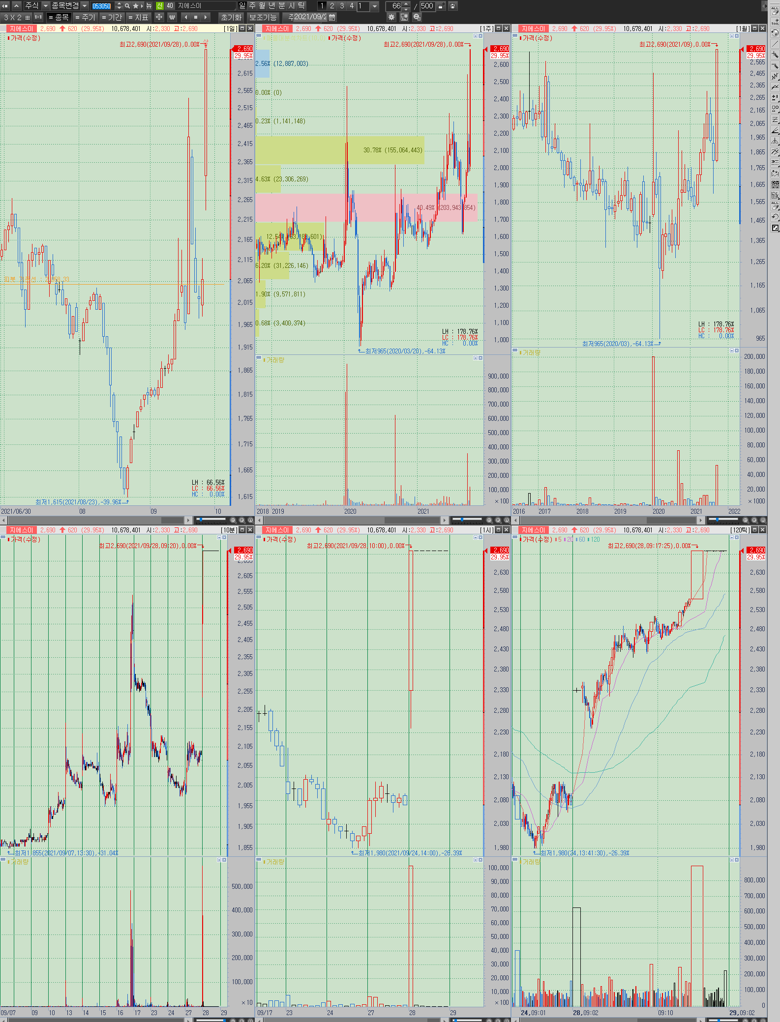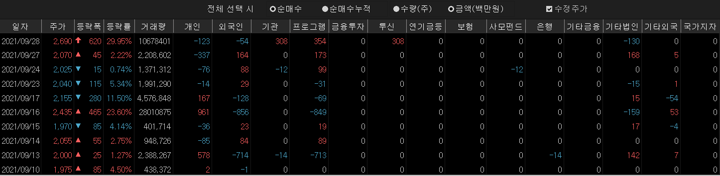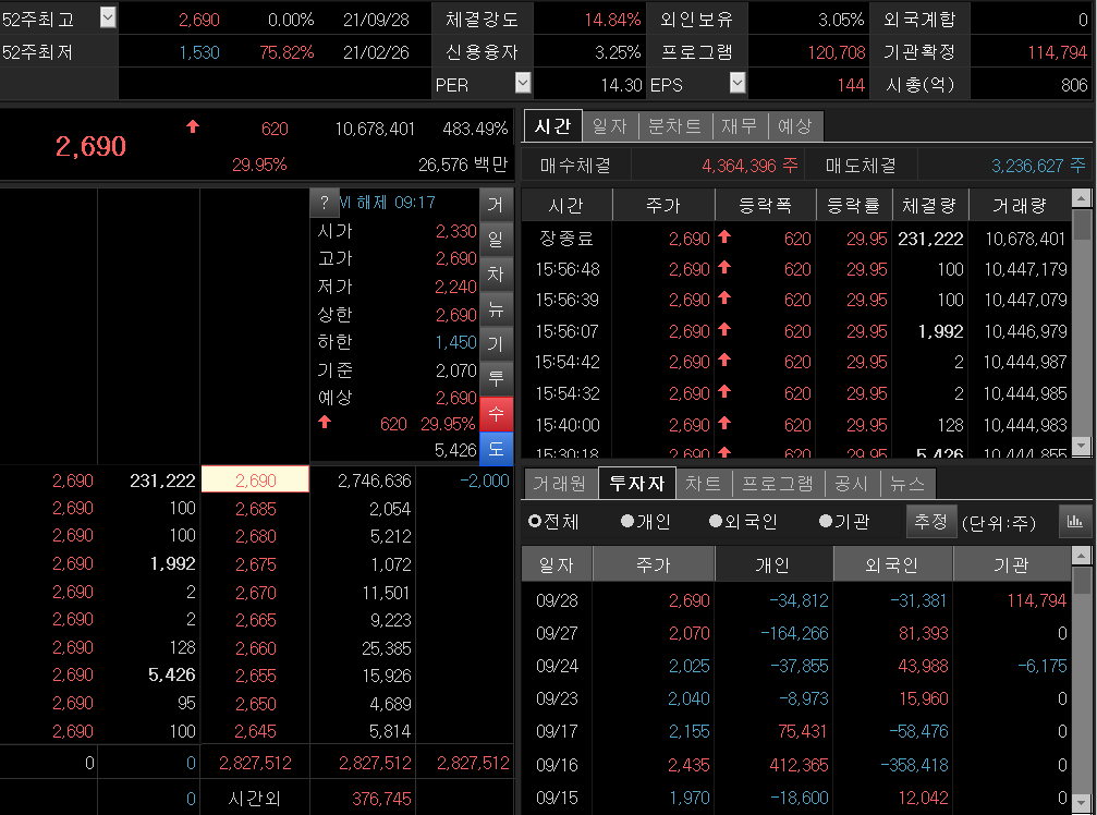 ▲ 이후의 포인트는 조정을 받아도 2300원을 버티는지에 대해서만 포커스를 맞추면 되며, 최근 10년 안쪽으로 최고가에 해당하는 영역이기에 오히려 새로운 가격대를 잡아나가는 계기가 될 수도 있는 자리다. 만약 2300원 밑으로 빠지더라도 2000원 까지만 버텨주면, 원래 기업이 가진 기본기가 있기 때문에 섹터 이슈만으로도 충분히 우상향 및 새 추세 진입이 가능해짐. 상한가로 인한 시장의 주목도가 마무리되는 시점까지 주의 요망.