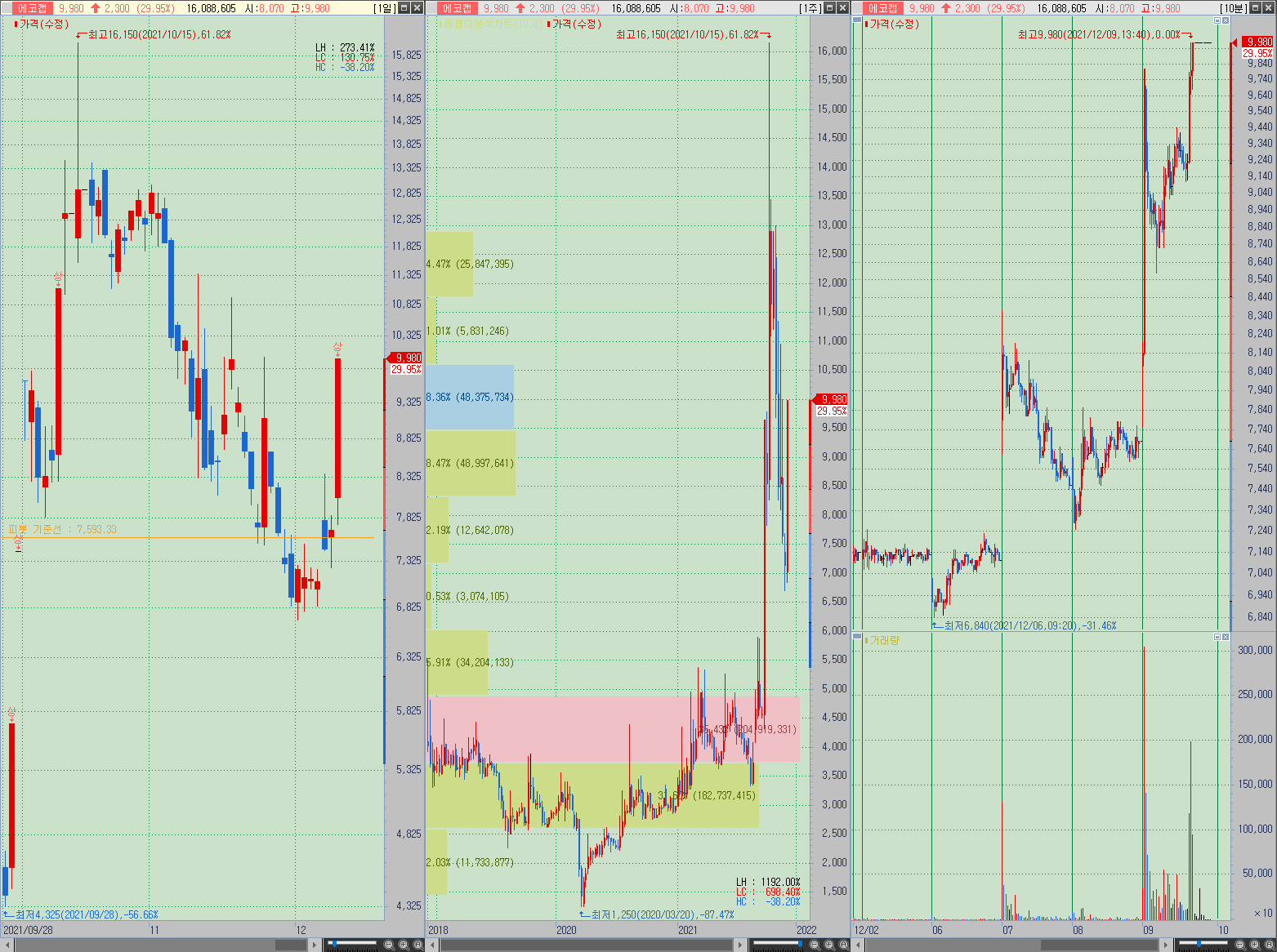 ▲ 작년은 순이익 적자를 기록한 에코캡이지만 전체적인 기본기는 양호한 편이며, 위에 언급한 바와 같이 전기차 관련된 섹터에서는 어디든 걸쳐있는 상황이기 때문에 다방면에서 잔돌리기가 일어나도 이슈를 받고 추가적인 상승을 만들어낼 여지가 다분한 종목이므로 상승 흐름이 마무리 되어도 관심을 가지고 지켜볼만함.