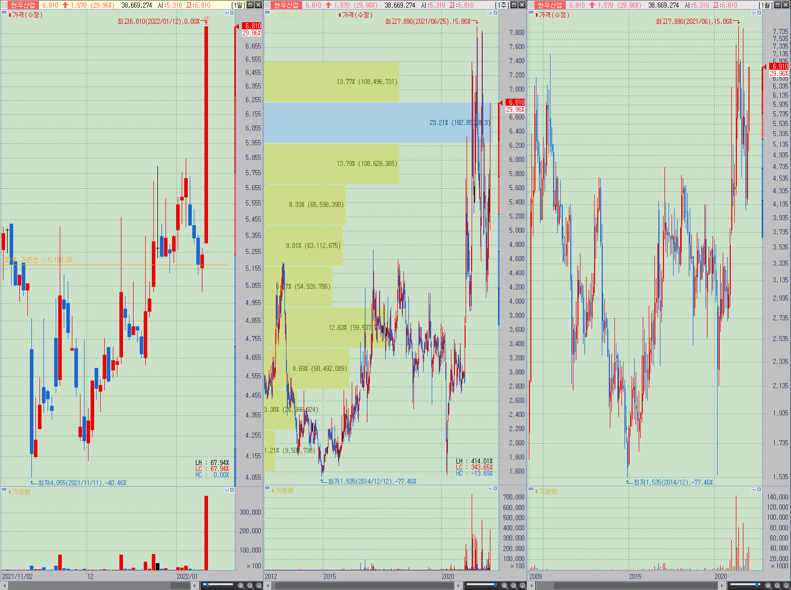 ▲ 현재 현우산업의 12일 종가인 6810원은 현재 지점부터 6270원 까지가 3년간 최대 매물대(28.59%)에 해당하는 구역이며 그리 멀지 않은 21년 6월에 종목상 최고가가 7890원으로 찍혀있는 점을 볼 때, 상승 여지보다는 저항에 맞고 조정 가능성이 조금은 높은 상황이다.