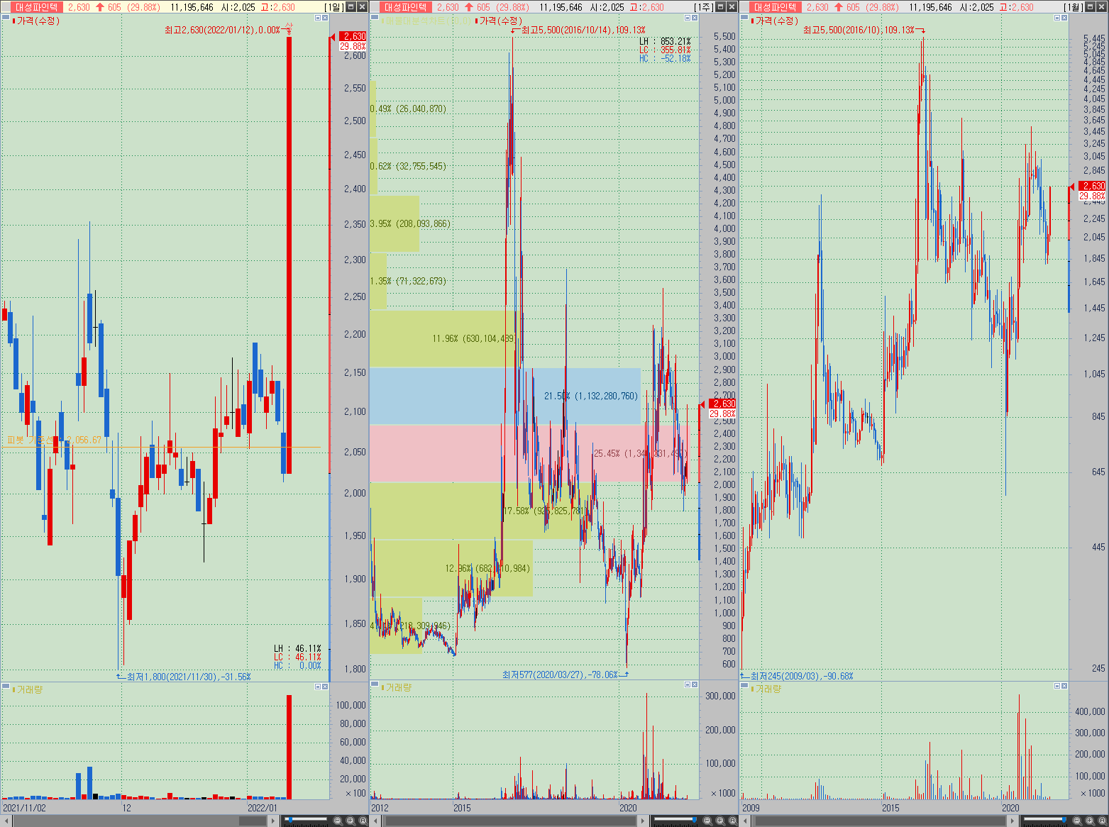 ▲ 대성파인텍은 21년 1~3분기 사이에 장기저항 돌파 시도를 구준히 해왔지만, 마지막 돌파에서도 실패로 돌아가자 하방추세로 주 매물대 아래까지 가격이 내려간 상태였으며, 금번 상한가로 주 매물대로 다시금 진입하며 장기저항 돌파를 시도할 수 있는 영역에 들어섰다.