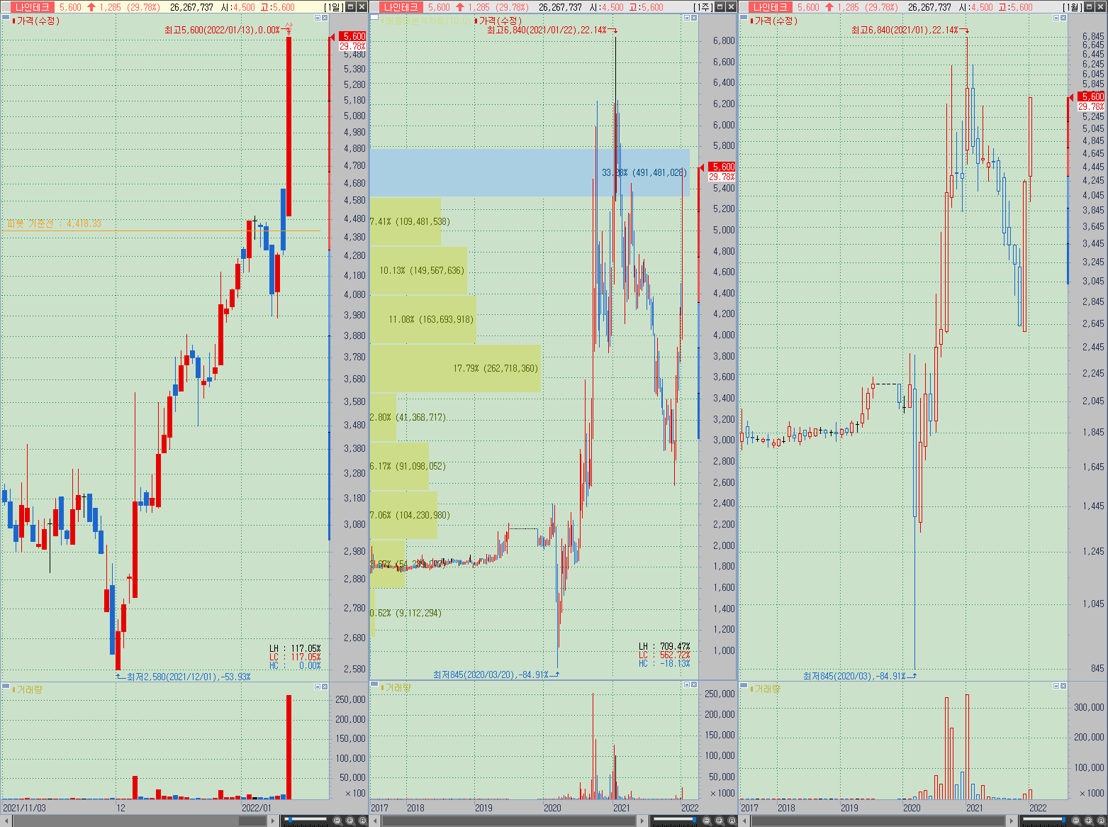 ▲ 나인테크는 또한 20년 4월에 스팩 변경상장을 거친 기업이기 때문에 종목상 의미있는 데이터는 1년 반 정도만 쌓여있기 때문에 전고점이 있다고 해도 큰 저항이라고 보기는 어려움. 따라서 금번 상승을 최대한 고가에서 마치고 조정을 받으며 현재 자리까지 내려오는 정도의 핸들링을 보여주는 것이 가장 베스트라 할 수 있다.