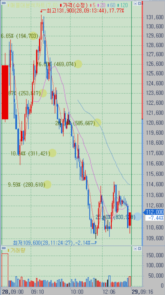 ▲ 10시 초반에는 9시 초반에 깨졌던 장대양봉 구간인 12만원 밑에서 거래가 일어나며 버텨내는 모습을 보였지만 이내 매도물량이 연이어 등장하며 한 시간 전의 저점인 11.7만원을 깨게 되었다.
