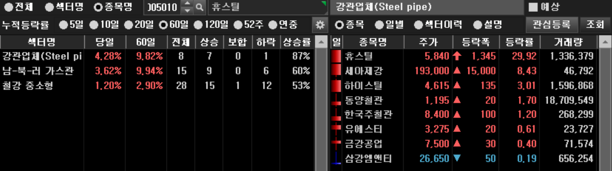 ▲ 철강 중소형주, 강관업체 관련주, 남북러 가스관사업 관련주.
