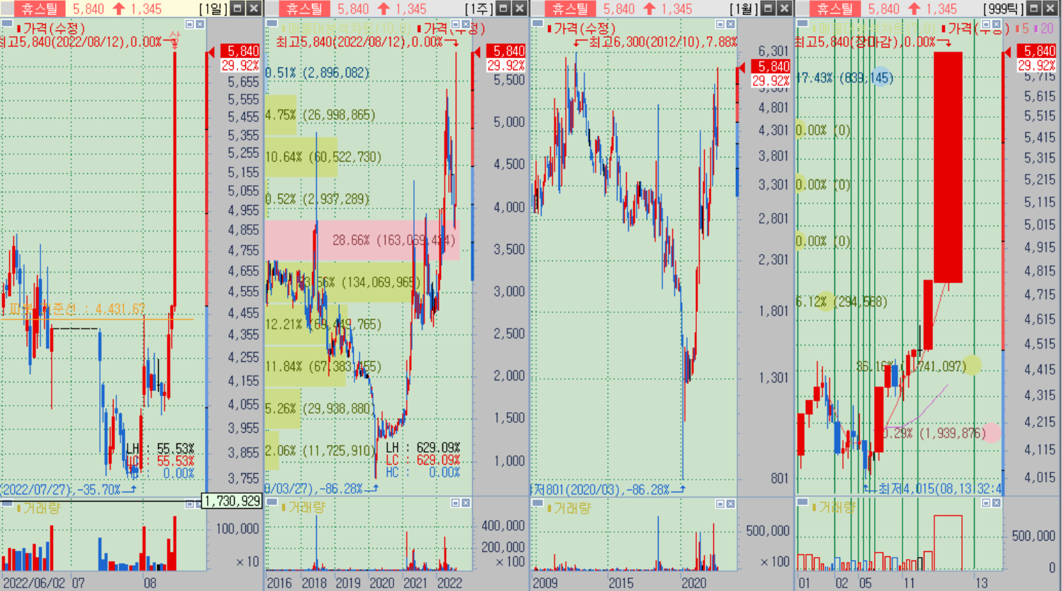 ▲ 휴스틸의 액면분할 이후 가격 회복을 넘어 10년 전에 만들어진 전고점을 돌파하려는 움직임을 보이고 있으며, 이는 현재 상한가 기준 +10% 안쪽이기에 무난한 돌파가 예상된다.